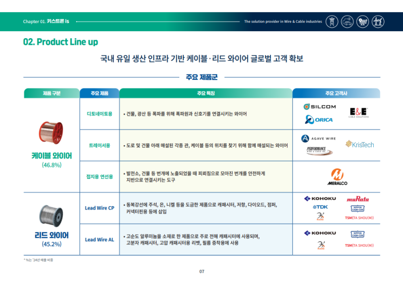 • 케이블 와이어는 인프라 및 산업용 전력·통신 설비에 사용되며, 미국 AGAVE WIRE 등 주요 파트너사와의 협력을 통해 북미 시장에서도 높은 신뢰를 확보하고 있음.