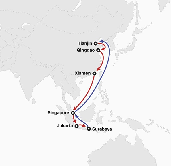 NIS 서비스는 ▲톈진(중국) ▲칭다오 ▲샤먼 ▲싱가포르 ▲자카르타(인도네시아) ▲수라바야 ▲싱가포르 ▲톈진 순으로 운영된다.