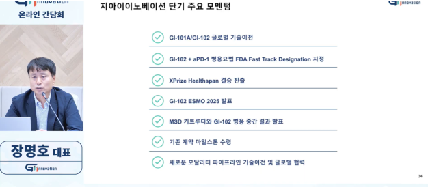 이날 그는 ▲GI-101A/GI-102 글로벌 기술이전 ▲GI-102+PD-1항체 병용요법의 미국 식품의약국(FDA) 패스트트랙 지정 ▲XPrize Healthspan 결승진출 ▲GI-102 ESMO 2025 발표 ▲머크(MSD) ‘키트루다’와 병용요법 중간분석 결과 발표 ▲기존 기술이전(L/O) 계약 마일스톤 수령 ▲신규 모달리티 기술이전 및 글로벌 협력 등 6가지 단기 주요 모멘텀에 대해서도 소개했다.