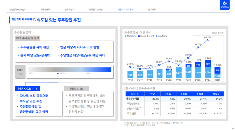• 내부 기준상 자사주 소각 중심 정책은 PBR 약 0.8배까지를 기본 원칙으로 설정