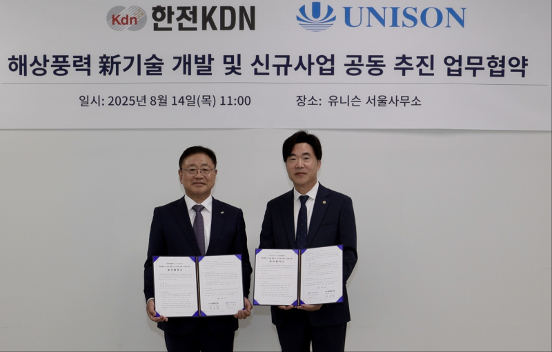 풍력발전 전문기업 유니슨이 전력 ICT 전문기업 한전KDN과 손잡고 해상풍력 기반의 ICT 융합 신사업을 공동 추진한다고 14일 밝혔다. 이날 유니슨 서울사무소에서 열린 협약식에는 유니슨과 한전KDN 양사 대표를 비롯해 주요 관계자들이 참석했다.