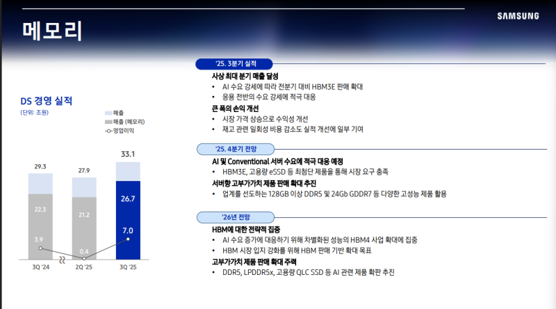 • HBM3E·DDR5·LPDDR5X 등 고성능 제품 판매 확대, NAND도 서버 SSD 중심으로 수요 우위