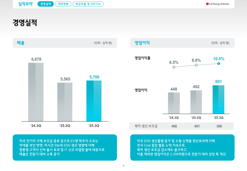 • 미시간 신규 Site Ramp-up에 따른 ESS 매출 증가와 소형 전지 매출이 이를 보완하며 전분기 대비 2.4% 증가한 5.7조 원 달성