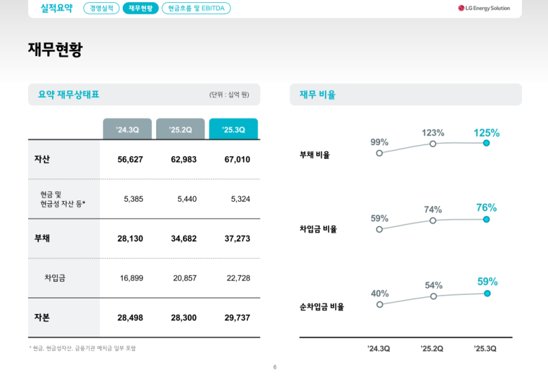 • 부채비율 125%, 차입금 비율 76%, 순차입금 비율 59%