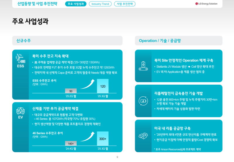 • EV 사업에서는 미국·유럽 프리미엄 차량향 100GWh 이상의 46시리즈 수주 계약 체결