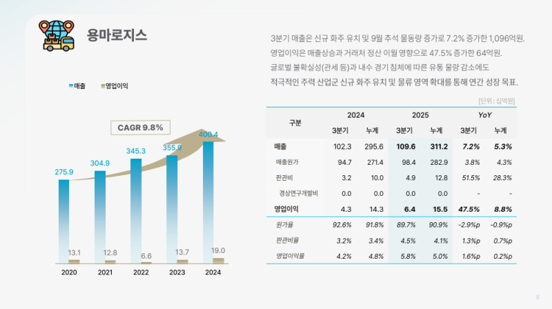 • 용마로지스 매출 1,096억 원 (YoY +7.2%), 신규 화주 유치 및 추석 물동량 증가 영향