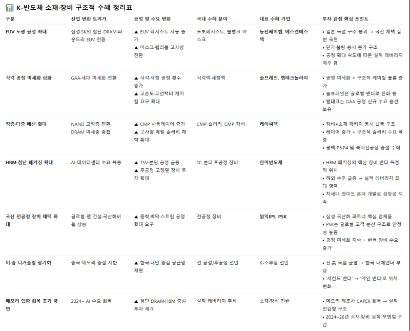 공정 미세화·AI 메모리 확대·글로벌 공급망 재편이라는 세 축이 동시에 작용하며, 국내 소재·장비 기업들은 더 이상 “경기 민감 산업”이 아니라 최첨단 반도체 가치 사슬의 필수 코어 산업으로 진화하고 있다.