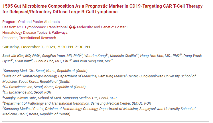 7일 미국 혈액학회(ASH 2024)에 공개된 초록에 따르면, CJ바이오사이언스는 ‘Gut Microbiome Composition As a Prognostic Marker in CD19-Targeting CAR T-Cell Therapy for Relapsed/Refractory Diffuse Large B-Cell Lymphoma’란 제목으로 연구결과를 발표한다.