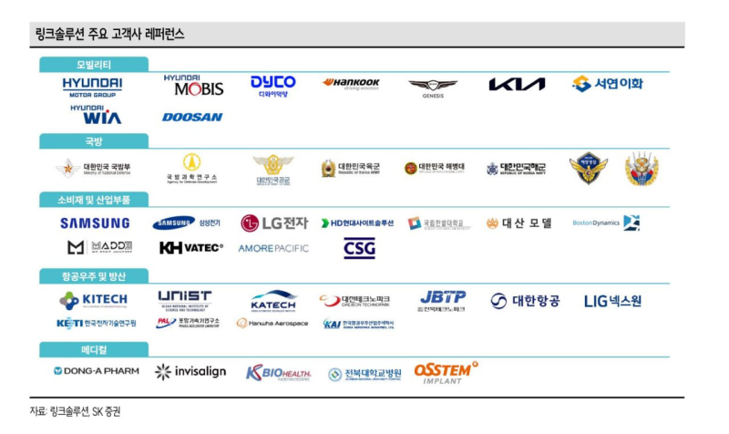 허선재 SK증권 연구원에 따르면 링크솔루션은 현대·기아차, 삼성전자, 한화에어로스페이스, 보스턴다이내믹스 등 500개 이상의 탄탄한 고객 레퍼런스를 확보한 점을 긍정적으로 평가된다. 또한 2025년 하반기부터 다수의 신규 프로젝트가 순차적으로 가시화될 것으로 전망하며, 마일스톤 달성 등으로 하반기와 내년까지 실적이 좋아질 것이라는 회사 측의 기대감을 뒷받침했다.