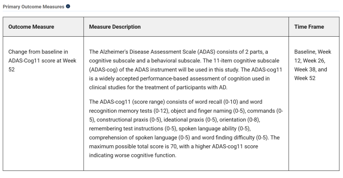 이에 따르면 1차종결점인 ADAS-cog11에서의 수치변화를 공시에서 주의깊게 봐야한다. 해당 수치에서의 결과에 따라 성공유무를 판별할 수 있을 것으로 보인다.