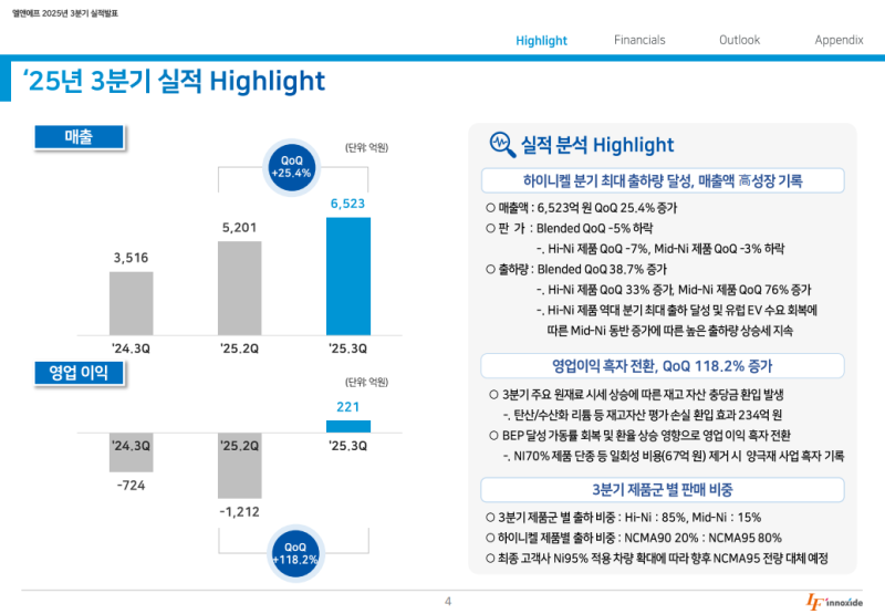 • 25년 4분기 출하량은 하이니켈95% 제품의 견조한 증가를 반영하여 3분기 대비 약 2% 증가 전망