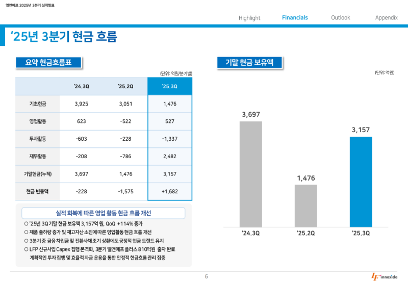 • 영업활동 현금흐름은 출하량 회복에 따라 지속 확대되고 있으며 EBITDA·운전자금 측면에서도 긍정적 흐름 유지 가능