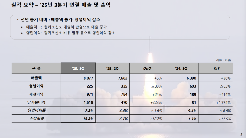 • 3분기 한화필리조선소 매출은 약 1,684억 원, 손실은 약 390억 원