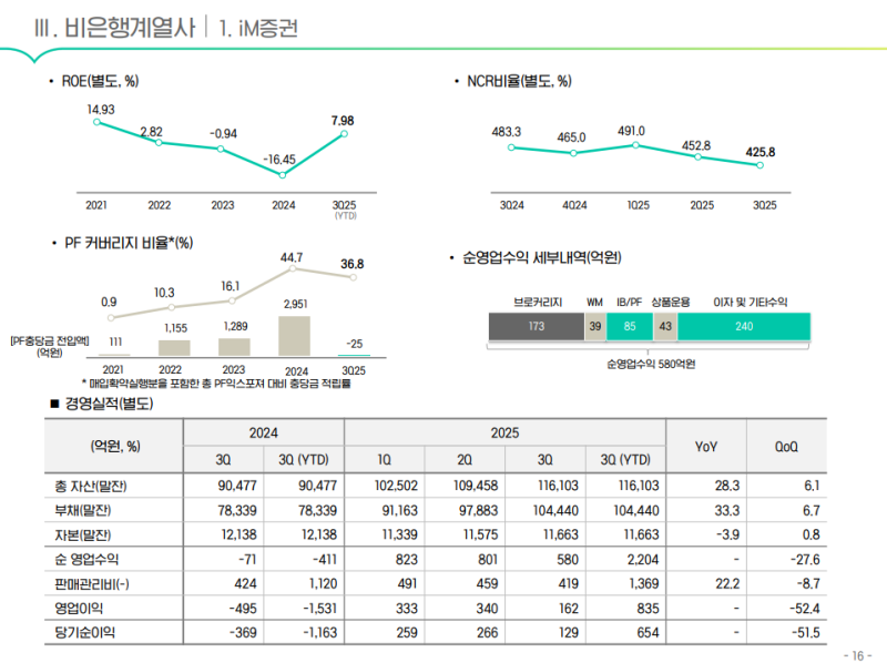 • iM증권 : 3분기 누적 순이익 654억 원, 5개 분기 연속 적자 종료 후 흑자전환