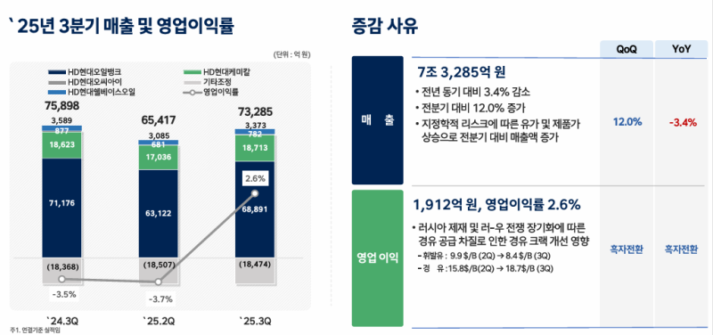 • 매출액 18.2조 원(+9.8% YoY, +5.9% QoQ). 정유 흑자 전환과 조선·전력기기 호조
