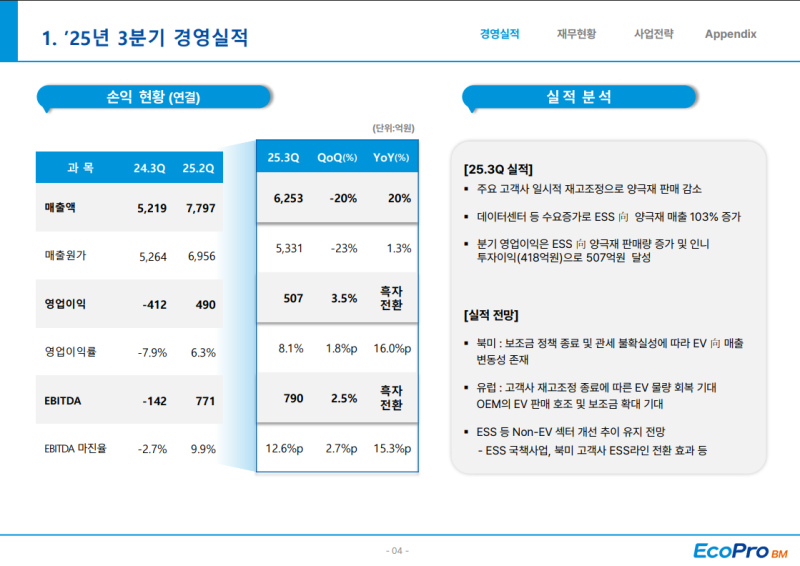 • 매출은 전분기 대비 20% 감소했으나 ESS향 양극재 확대와 인도네시아 니켈 제련소 투자이익 418억 원 반영으로 영업이익 507억 원 기록