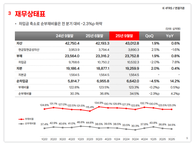 • 차입금 축소에 따라 순부채비율은 전 분기 대비 2.3%포인트 하락