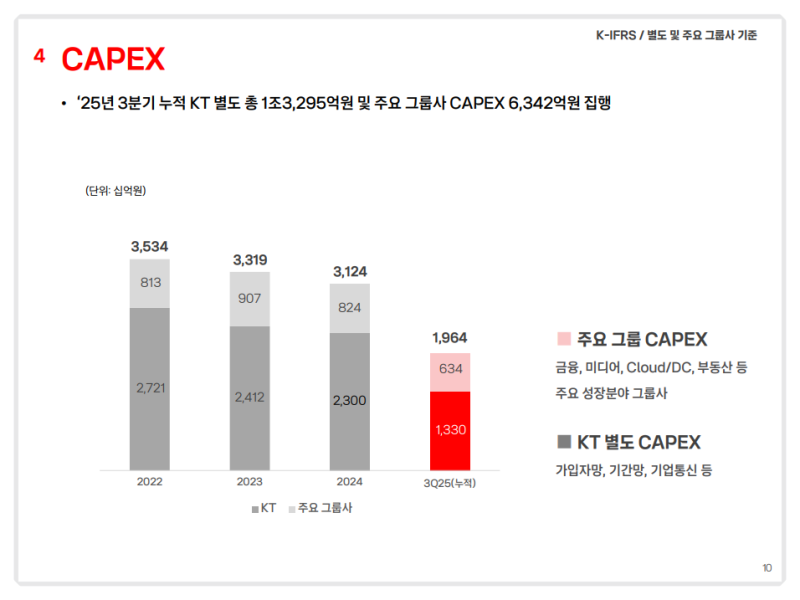 • KT 별도 기준 투자 지출은 1조 3,295억 원