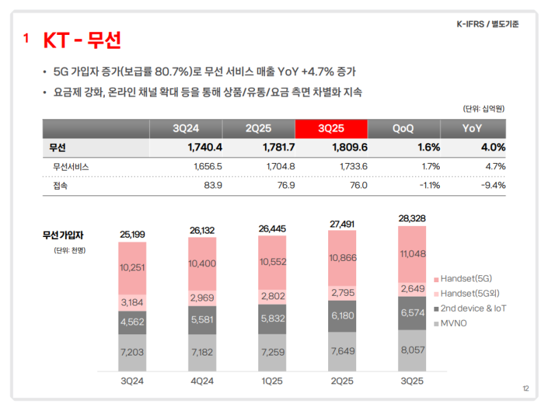 • 5G 가입자 확대가 매출 성장을 견인하며, 5G 보급률은 80.7% 기록