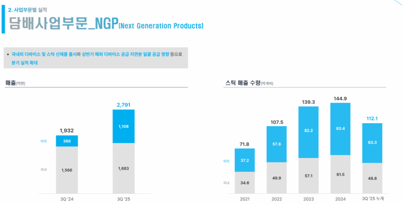 • 국내 NGP: 매출액 1.7천억원(YoY 8%) 시현. 스틱 수량 YoY 11% 증가. 국내 NGP 침투율 22.2%(YoY +1.4%p) 확대된 가운데, 신제품 출시로 M/S 안정적 흐름 유지 중