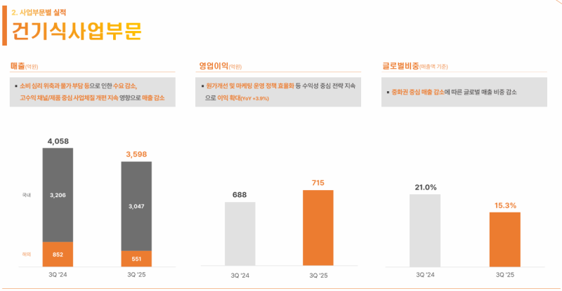 • 건기식 사업부: 매출액 3,598억원(-11.3% YoY), 영업이익 715억원(+3.9% YoY, OPM 19.9%) 소비심리 부진 및 체질 개선을 위한 채널 개편 영향으로 매출액은 감소했으나 비용 절감으로 수익성이 개선