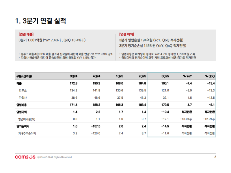 • 3분기 연결 당기순이익: -145억 원 (YoY 적자전환, QoQ 적자전환)