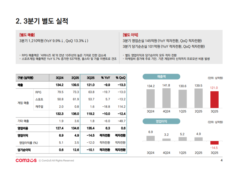 • 3분기 별도 영업이익: -145억 원 (YoY 적자전환, QoQ 적자전환)