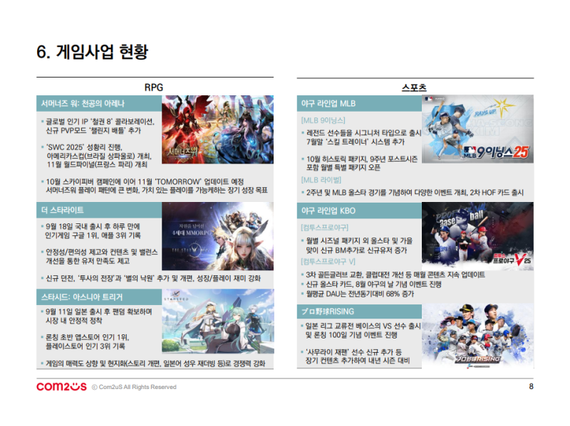 • ‘컴투스프로야구V’와 ‘MLB 라이벌’의 성과가 분기별로 확대되며 매출 기반이 높아진 상태