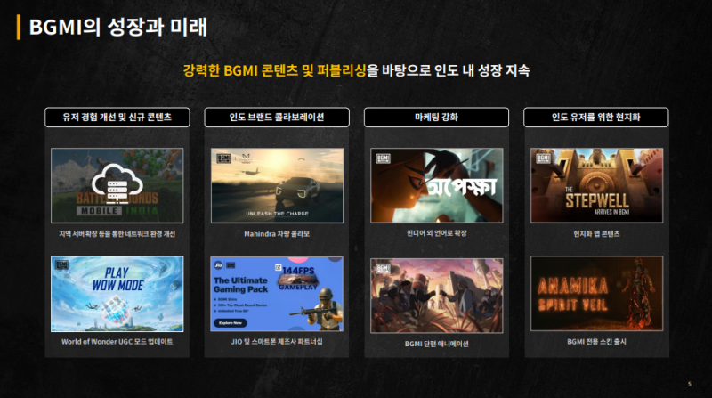 • 인도 BGMI는 현지 유저들이 선호하는 현지화 콘텐츠를 확대하며 글로벌 라이브 서비스 유지