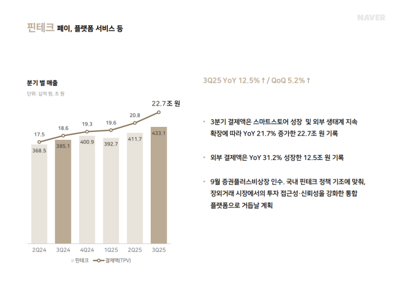 • 3분기 네이버페이 결제액 22.7조 원으로 전년 동기 대비 +21.7% 증가