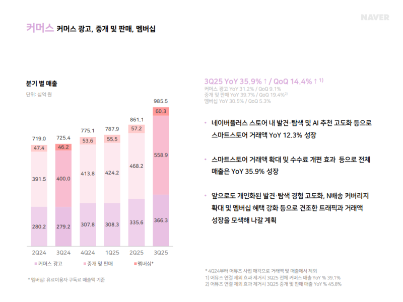 • 커머스 매출 9,855억 원(+35.9% YoY), 스마트스토어 매출 +102% 성장, 수수료 개편 효과 온기 반영