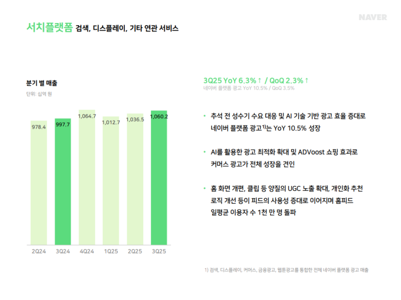 • 네이버 플랫폼 광고 : (QoQ +3.5 %, YoY +10.5 %) 성장