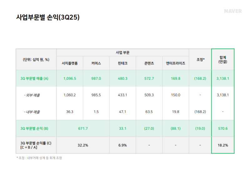 • 서치플랫폼 및 커머스 통합 부문은 견조한 매출 성장에도 AI 접목 및 쇼핑 프로모션 비용 영향으로 전년 동기 대비 이익률이 소폭 하락하였으나 30% 이상의 안정적 이익률 유지