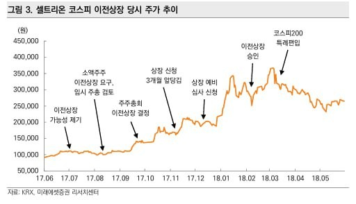 과거 셀트리온의 경우에는 2017년 당시 코스닥에서 코스피로 이전상장 임시주총, 이전상장 결정 시점부터 이전상장 승인시점까지 기대감이 반영되면서 주가가 약 100% 이상 오르기도 했다.