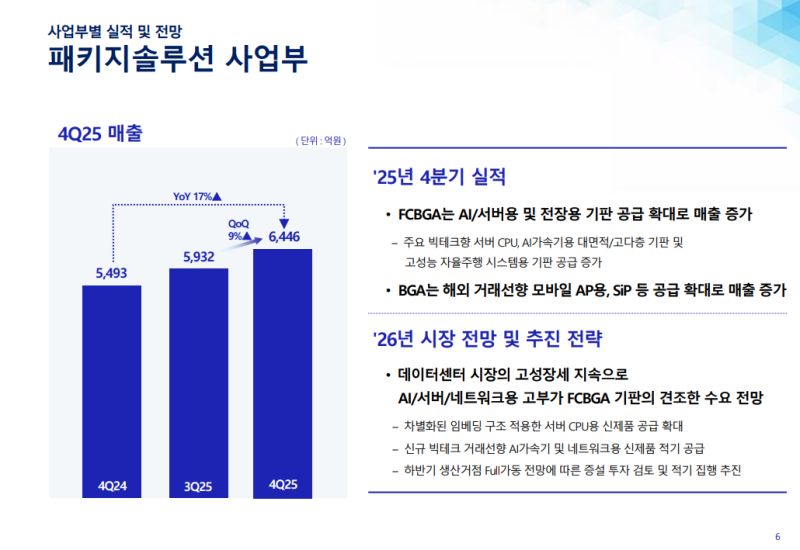 • FCBGA 부문 PC 시장 계절적 비수기 및 교체 수요 둔화 영향 존재하나 AI 서버 및 데이터 센터 관련 수요 강세 지속 예상