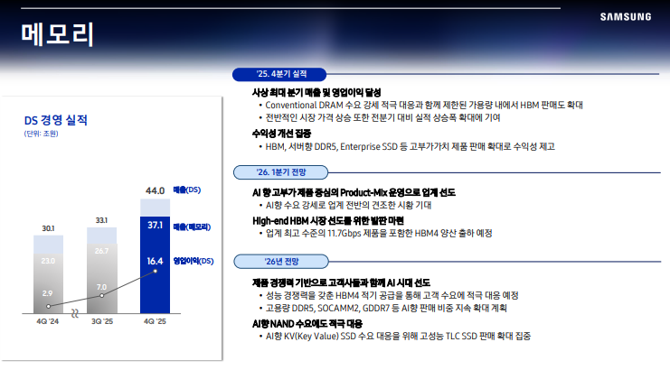 • 메모리 가격 상승과 제품 믹스 개선으로 DS 수익성 급반등
