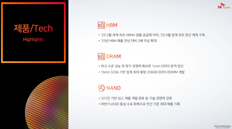 • HBM4 역시 고객과 협의한 일정에 따라 계획대로 진행 중이며, 2025년 9월 양산 체제 구축 이후 고객 요청 물량을 현재 양산 중