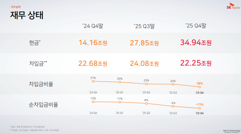 • 사상 최대 실적을 바탕으로 2025년 말 기준 현금성 자산은 34.9조 원으로 전년 말 대비 20.8조 원 증가