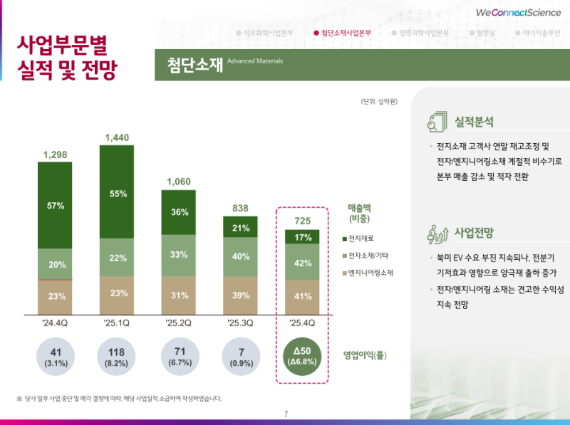 • 첨단소재 부문은 4Q25 매출 7,250억 원, 영업손실 500억 원 기록