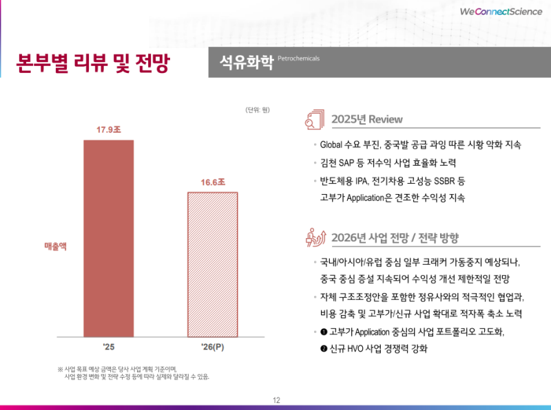 • 석유화학 부문은 4Q25 매출 3조 9,470억 원, 영업손실 2,390억 원 기록