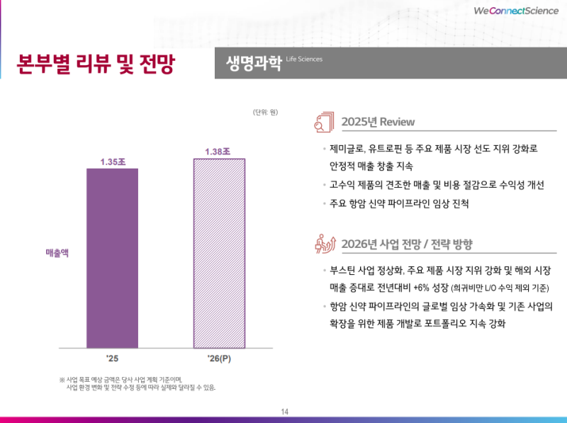 • 생명과학은 글로벌 임상 3상 진행 중인 두경부암 치료제 과제와 2025년 11월 미국 하이브셀로부터 도입한 신장암 신약 후보 물질을 포함해 항암 신약 파이프라인 강화 지속