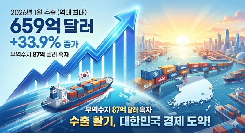 2일 관세청이 발표한 '2026년 1월 수출입 현황(잠정치)'에 따르면 지난달 1일부터 31일까지의 수출액은 658억5500만달러(약 95조5000억원)로 전년 같은 기간보다 33.9% 증가한 것으로 집계됐다. 이는 1월 실적으로는 역대 가장 많은 금액이다.