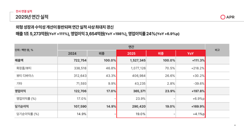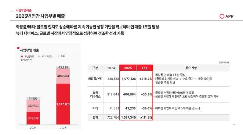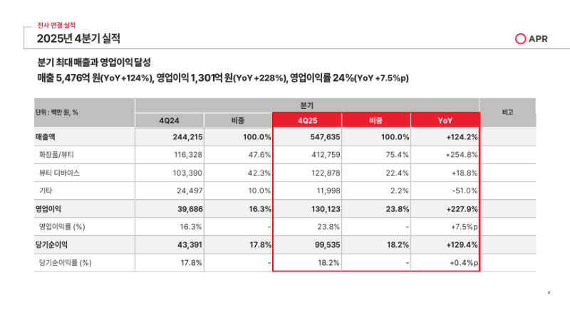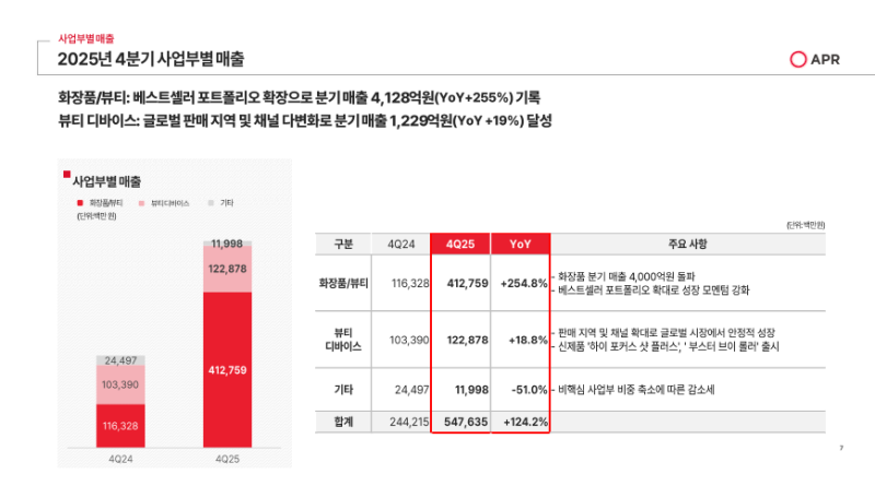 • 2025년 2분기부터 200%대의 큰 폭 성장률이 지속되고 있으며 이번 분기에는 화장품 부문 최초로 분기 매출 4,000억 원 돌파