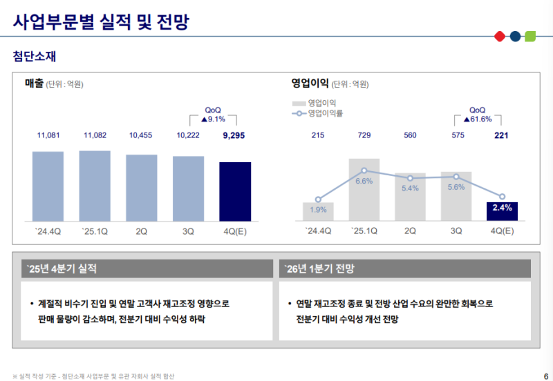 • 연말 고객사 재고 조정 및 계절적 비수기 진입 영향으로 판매량이 감소하며 전분기 대비 수익성 하락