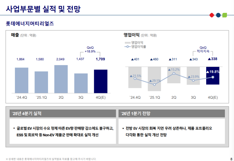 • 4분기 매출은 4조 799억 원, 영업손실은 4,339억 원으로 계절적 비수기에 따른 수요 감소와 LCI 초기 가동 영향으로 전분기 대비 적자 규모 확대