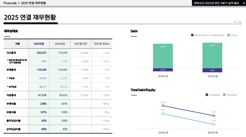 • 2025년 말 기준 부채비율은 전년 말 대비 39%p 감소한 228% 기록
