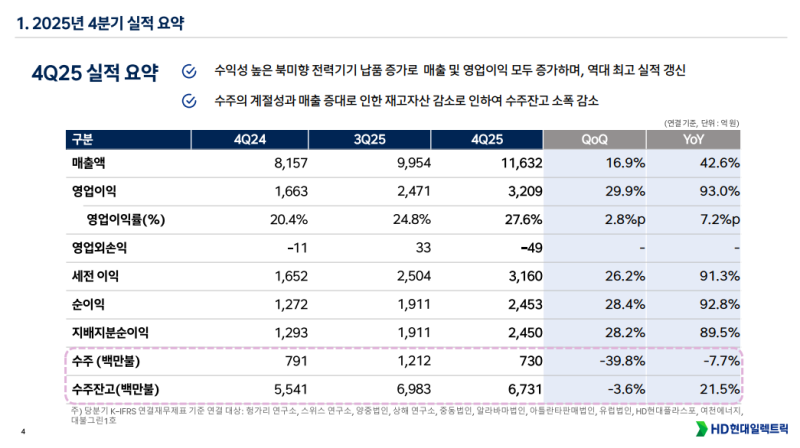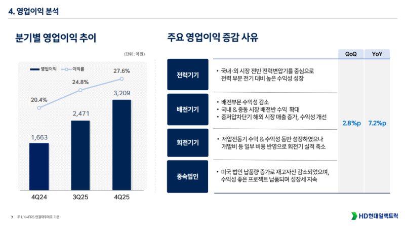 • 북미 전력기기 납품 호조에 따른 아틀란타 법인 매출 증가로 4Q25 영업이익률 상승의 주요 요인으로 작용