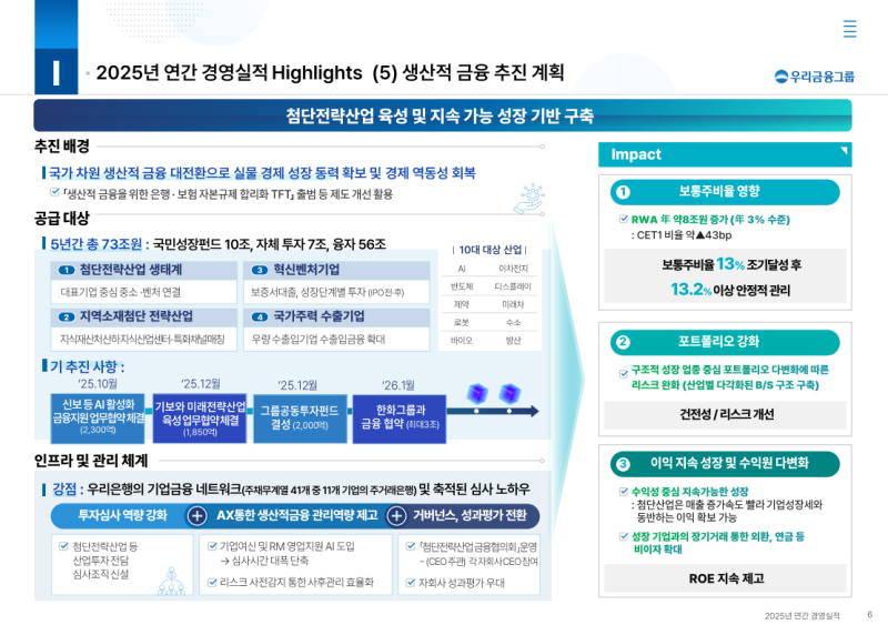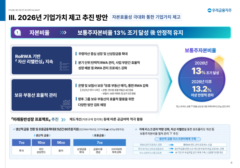 • 2026년 중 보통주자본비율 13% 조기 달성 후 2026년 이후 13.2% 이상 수준에서 안정적 관리 목표