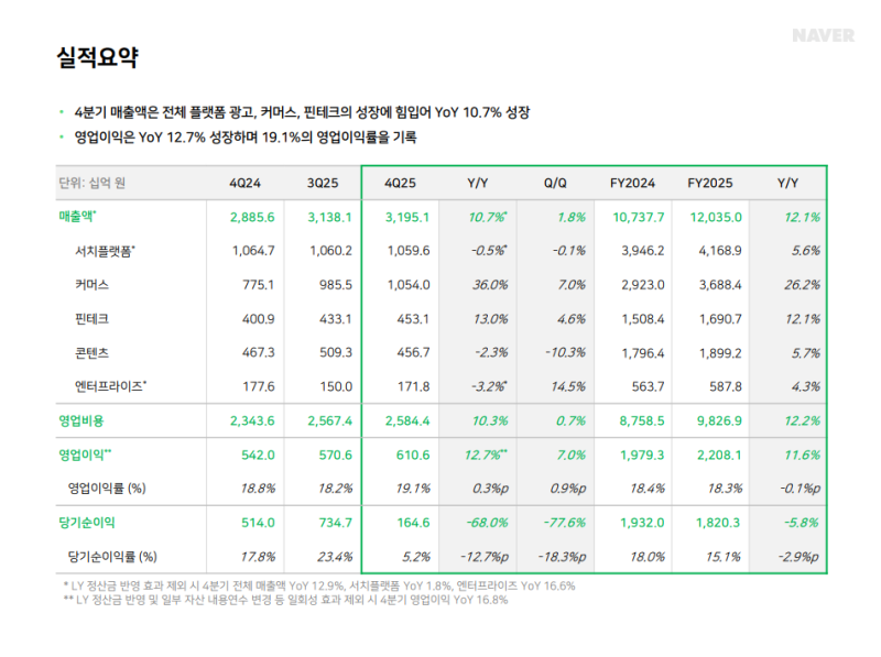 • 4Q25 매출액은 광고, 커머스, 핀테크 등 핵심 사업 성장에 힘입어 3조 1,951억 원(YoY +10.7%) 기록