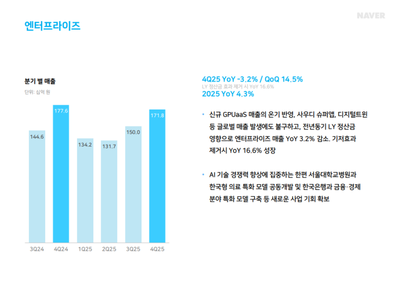 • 4Q25 엔터프라이즈 매출 1,718억 원, 라인야후 기저 제거 시(YoY +16.6%)